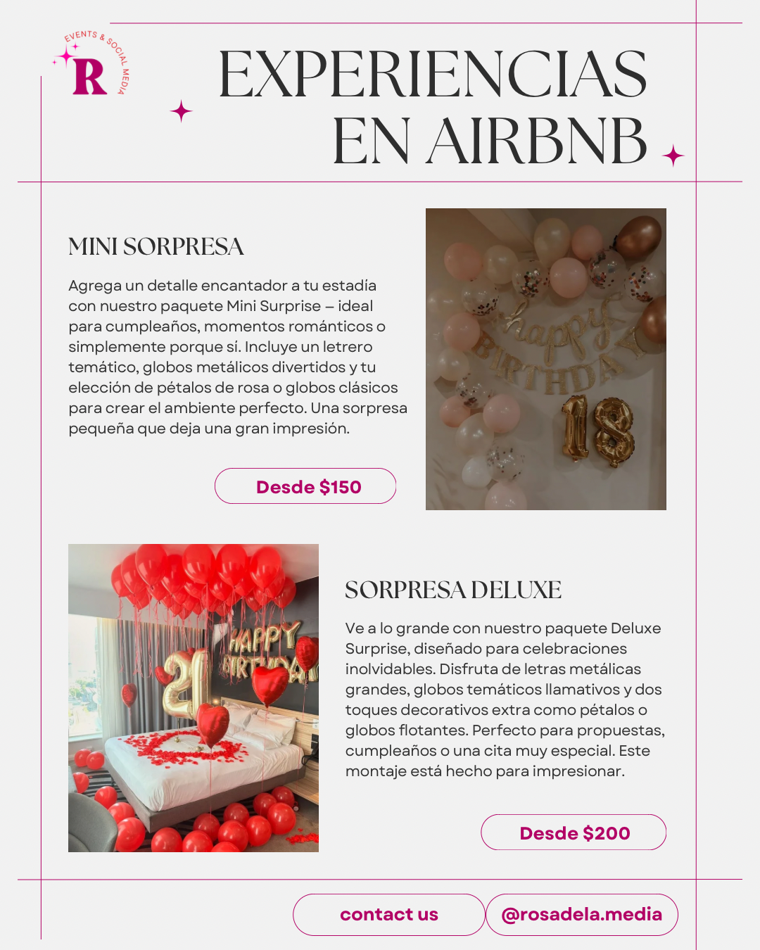 Rosadela Media nace con la idea de crear, decorar y capturar momentos. Ofrecemos experiencias personalizadas y detalles que hacen la diferencia en estadías en Airbnbs, espacios acogedores o celebraciones íntimas. ✨ Todos los meses hay una excusa para celebrar algo o a alguien especial, y con Rosadela hacemos que cada ocasión sea inolvidable con decoraciones únicas, ambientaciones especiales y detalles como fridge stocking estilizado. 💕 🎉 Tenemos paquetes establecidos para tu conveniencia, pero también puedes personalizarlos a tu gusto: cuéntanos tu idea, lo que quieres incluir y lo hacemos realidad.