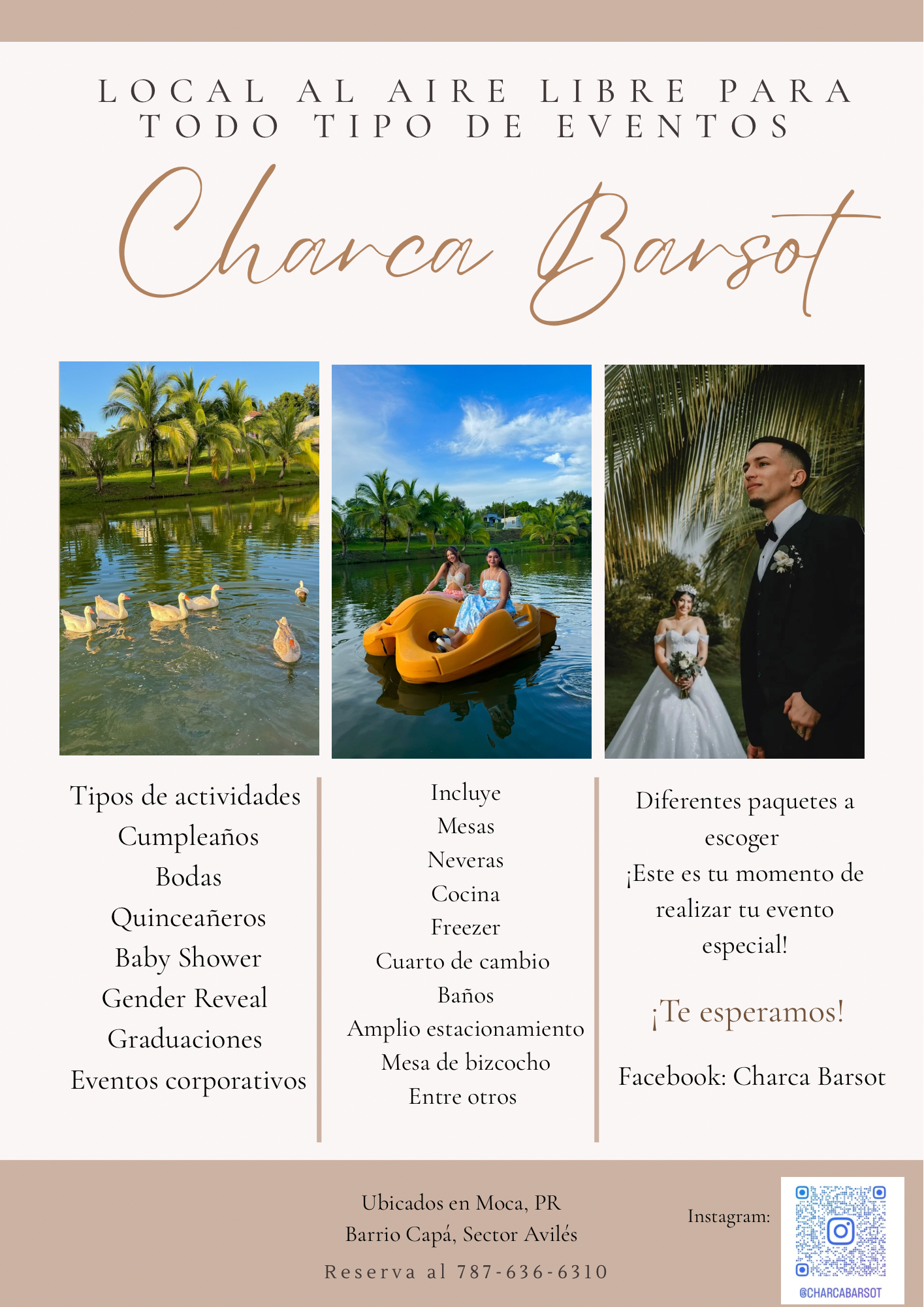 Local de actividades al aire libre ✨ Localizados en el pueblo de Moca,P.R Actividades a realizar: Cumpleaños Baby Shower Bodas Quinceañeros Eventos corporativos Gender Reveal Contamos con hospedajes para 6 personas 🎉 Contáctanos al 787-636-6310 Facebook: Charca Barsot Instagram: Charca Barsot