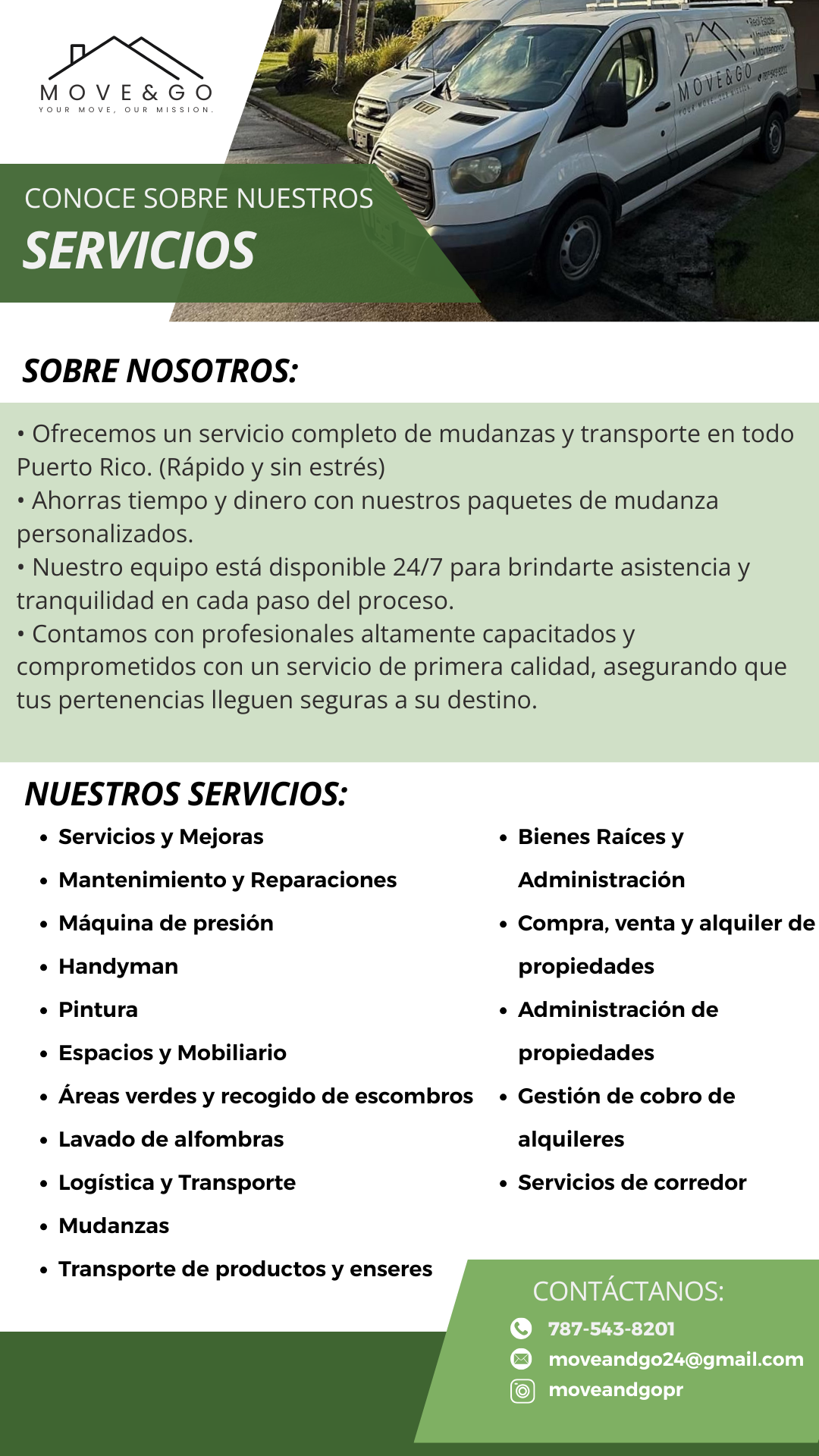 En Move & Go nos especializamos en hacer de tu mudanza una experiencia sin complicaciones, ofreciéndote también servicios de bienes raíces y mantenimiento. ¡Todo lo que necesitas para tu nuevo hogar, en un solo lugar!