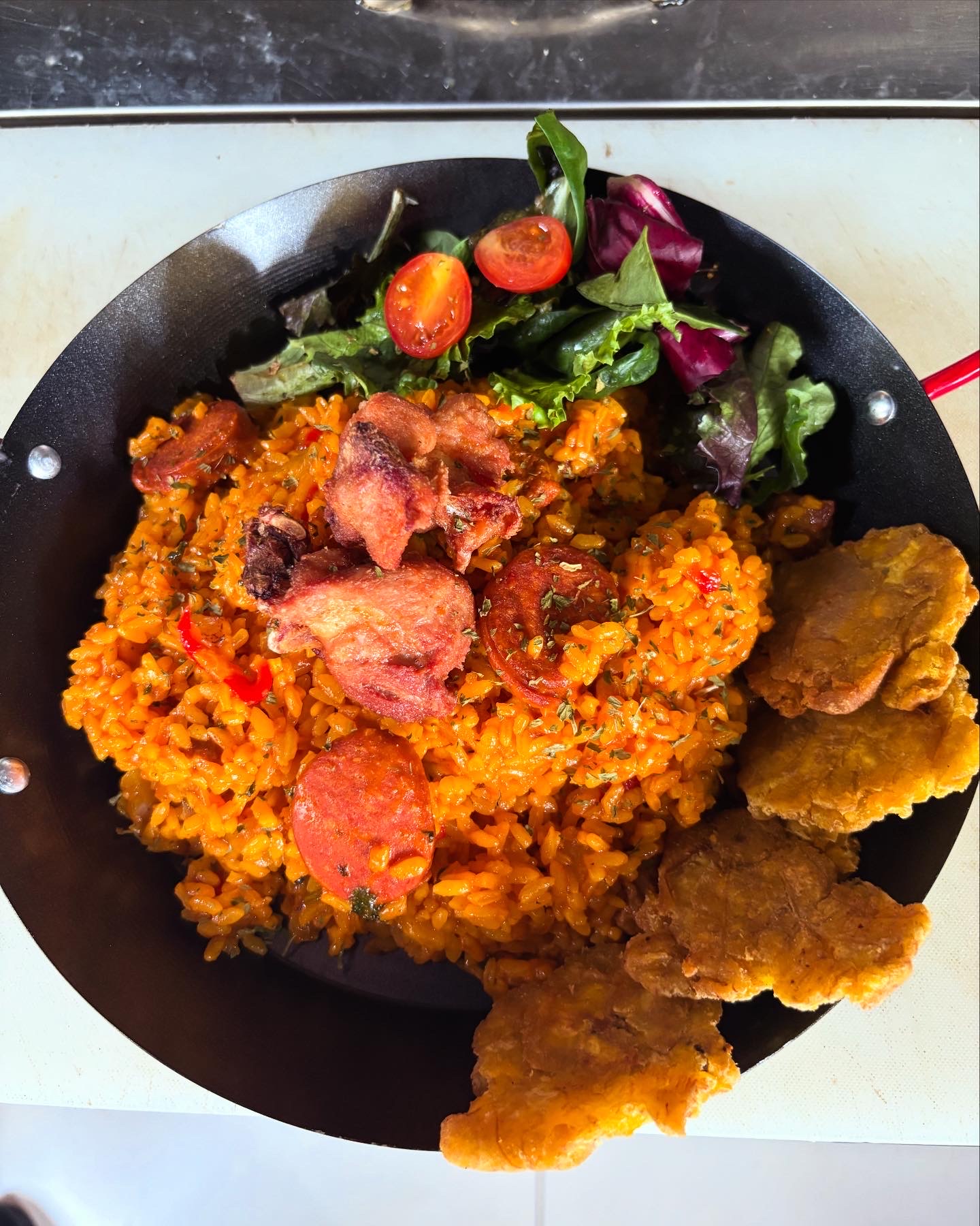 Invento del chef Deliciosa combinación de ingredientes frescos con el toque puertorriqueño.Carne frita,chorizo,longaniza,chicharrón de pollo,ensalada y tostones